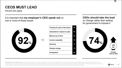 3. CEO ACTIVISM IS HERE TO STAY Een CEO die zich duidelijk uitspreekt over controversiële issues of maatschappelijke problemen wordt meer en meer gewaardeerd. Dat geldt zeker voor de CEO van het bedrijf waar mensen werkzaam zijn. Meer dan 90% vindt dat de hoogste baas niet alleen moet managen maar ook duidelijk moet maken waar hij en het bedrijf voor staan als het gaat om ethische omgang met nieuwe technologie of klimaatverandering. Dus wie zijn medewerkers wil inspireren en motiveren doet er goed aan om duidelijk te laten horen waar hij of zij voor staat.