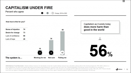 ONRECHT EN BOOSHEID Meer dan de helft van de respondenten denkt dat het kapitalisme meer kwaad dan goed doet. 60% van de respondenten gelooft niet dat de overheid handelt in hun belang. En ruim 70 procent vraagt om verandering en voelt onrechtvaardigheid. Het is dit gevoel dat het kapitalisme of “het systeem” voor hen niet werkt dat, ook in Nederland, alom tegenwoordig is. Waarom verslikken grote bedrijven zich ondanks een goed geoutilleerde corporate communicatieafdeling zo vaak in issues? Omdat dit ongenoegen en gevoel van onrechtvaardigheid bij grote groepen Nederlanders werkt als katalysator voor issues: een vonk wordt een veenbrand als het appelleert aan dit gevoel van onrechtvaardigheid.