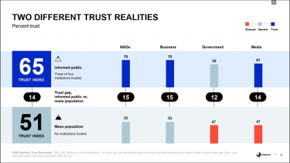 2. KLOOF TUSSEN DE ELITE EN MASSA NEEMT TOE De respondenten die “well informed” zijn (universitaire opleiding, bovenmodaal salaris en meer dan gemiddelde consumptie van kwaliteitsmedia) hebben veel meer vertrouwen in bedrijfsleven, overheid, NGO’s en media dan de mensen die dat niet zijn. En dat verschil tussen de “elite” en de “massa” was nog nooit zo groot. Herkenbaar. Het onderstreept opnieuw de noodzaak voor organisaties om bij de dialoog met de omgeving ook minder goed opgeleide groepen te betrekken. Het ligt altijd op de loer: je eigen omgeving (en die is vaak hoog opgeleid) als maatstaf nemen en je vooral te richten op media die door hen gelezen en gezien worden te gebruiken om signalen over het maatschappelijk sentiment op te pikken.